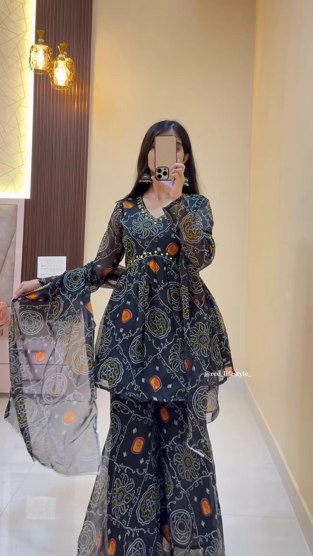 The neckline is embellished with intricate embroidery, adding texture and refinement to the overall look. The embroidery complements the geometric design, making the outfit suitable for both casual and semi-formal occasions.